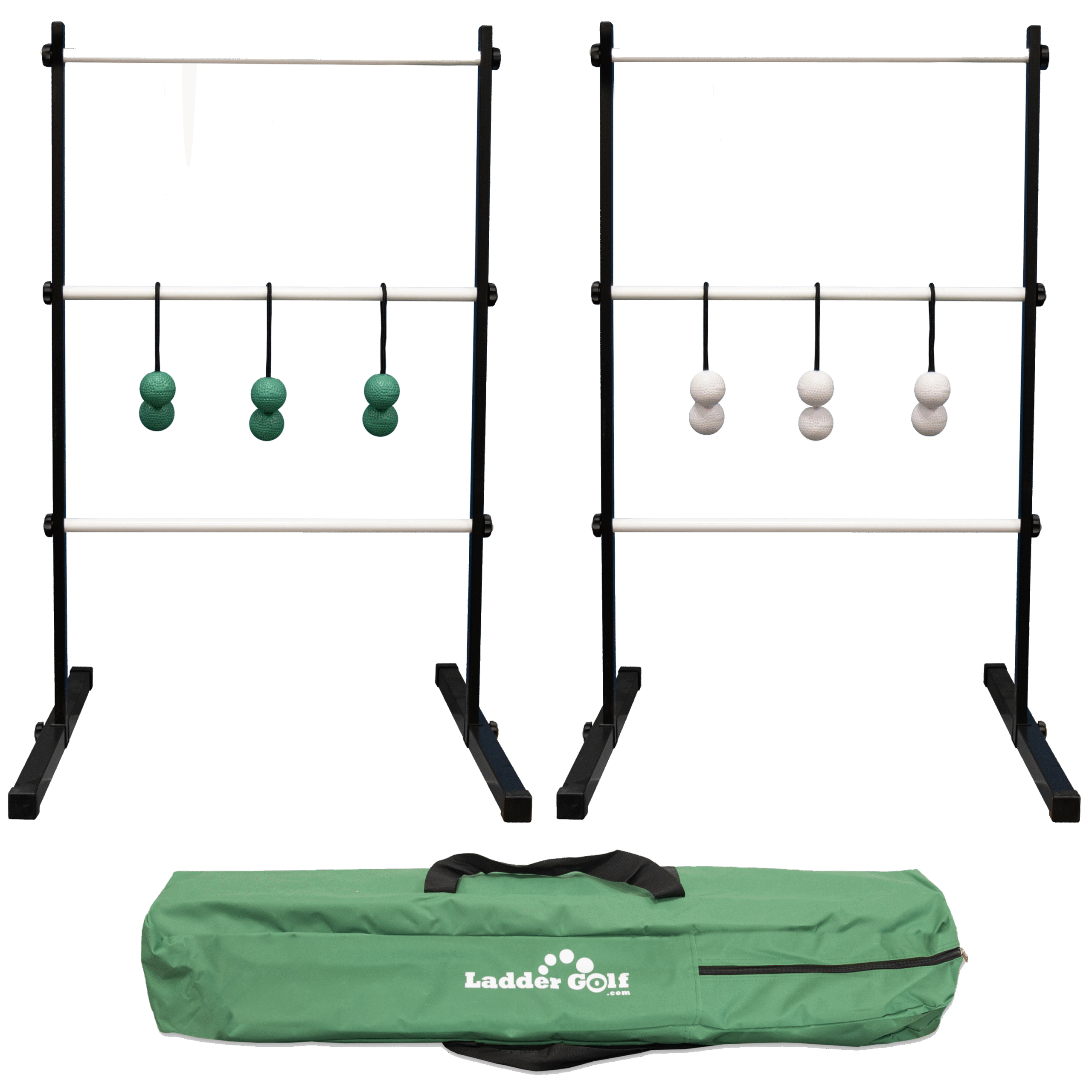 Im Lieferumfang enthalten sind 2 Ladder Golf Gerüste aus Metall, 1 Set Soft-Bolas in Grün und 1 Set Soft-Bolas in Weiß, Verbindungsschrauben sowie ein Set offizieller Ladder-Game-Regeln. Alles passt in eine robuste Nylon-Transporttasche bei einem Gesamtgewicht von unter 6,5 kg.